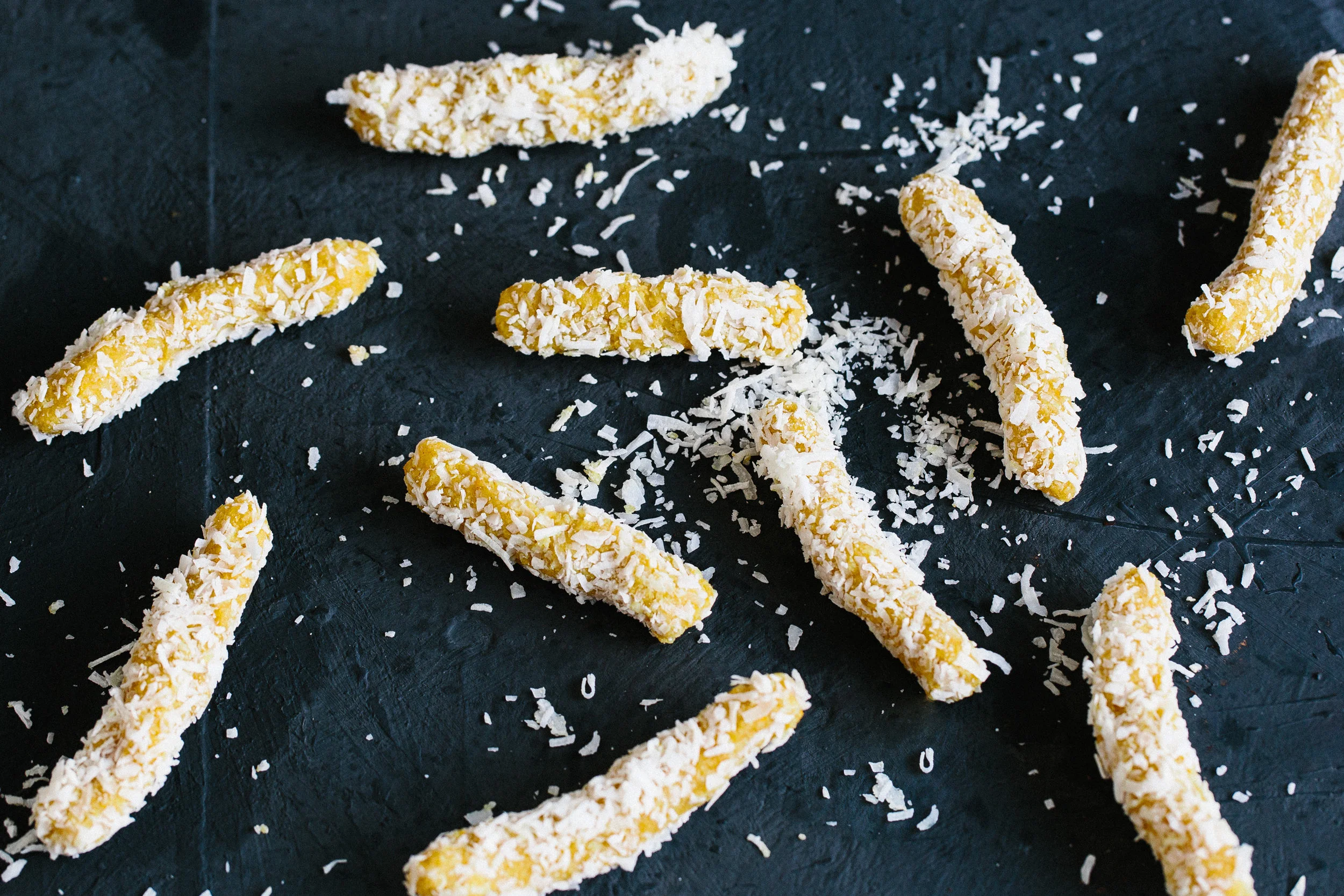 6. Use your hands to break away some of the dough and roll them into logs. Place them onto the shredded coconut and roll them in it.